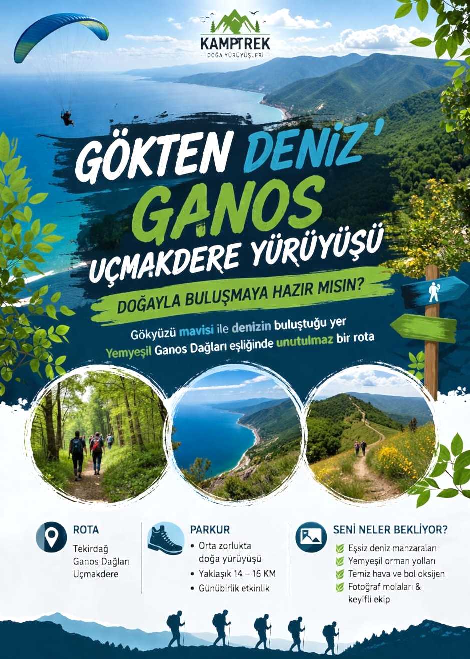 Uçmakdere rotasi, Ganos Daglari’nin en yüksek sirtlarindan birinde baslar. Yaklasik 900 metre irtifa kaybi içeren bu etkileyici hat, yürüyüs boyunca Marmara Denizi’ni adeta kusbakisi izleme imkâni sunar.